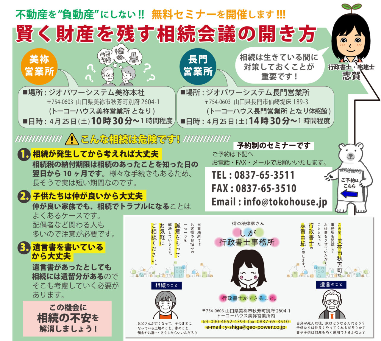 「財産なんてそんなにないから大丈夫」「遺言とか自分とは縁のないはなし」等々、気にはなっているけどよく分からないのが遺産相続。 そんな皆さんに朗報です!! トーコーハウス美祢・長門の両営業所にて、「町の法律家さん」の行政書士による、無料のセミナーを開催します!(^^)!