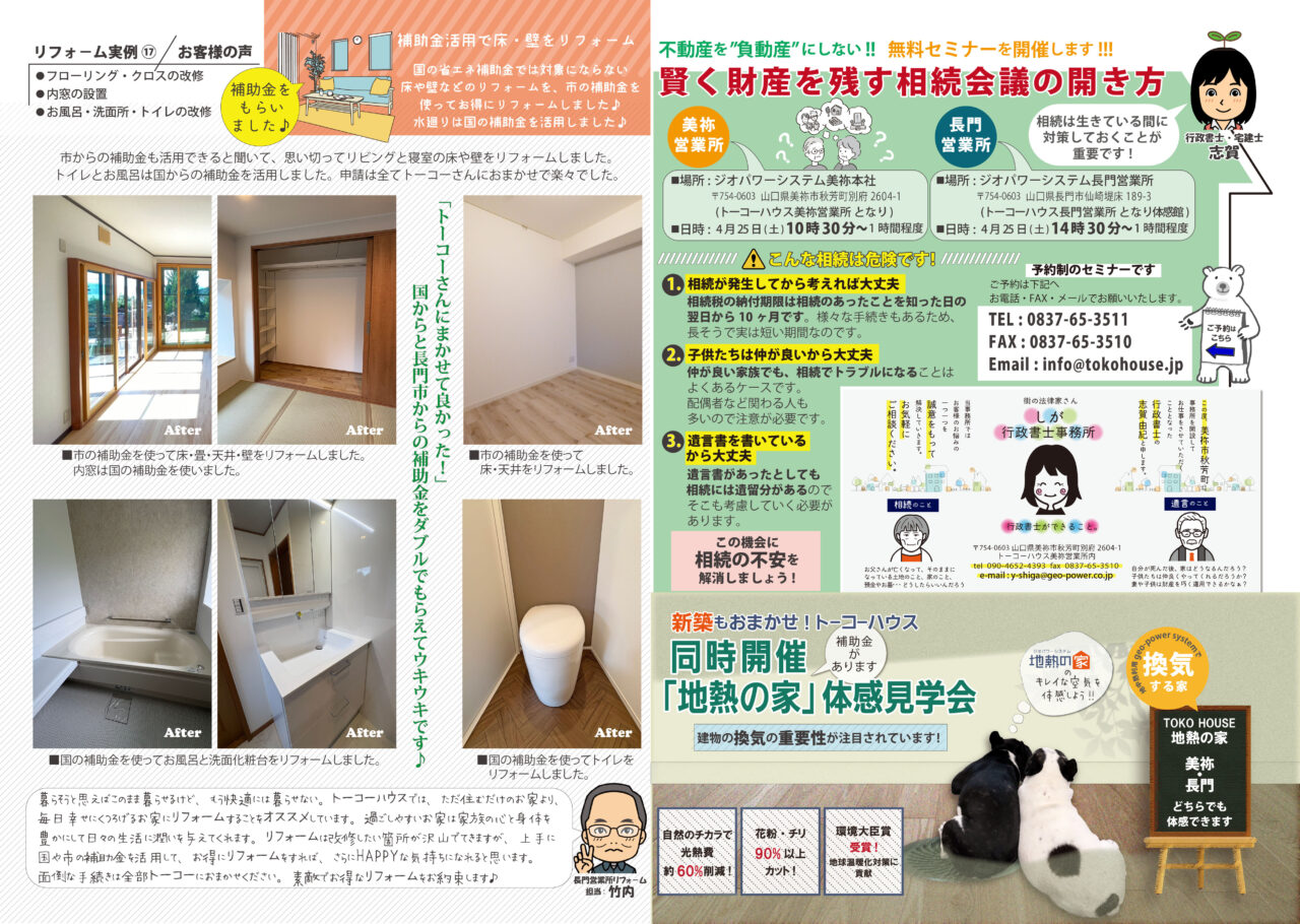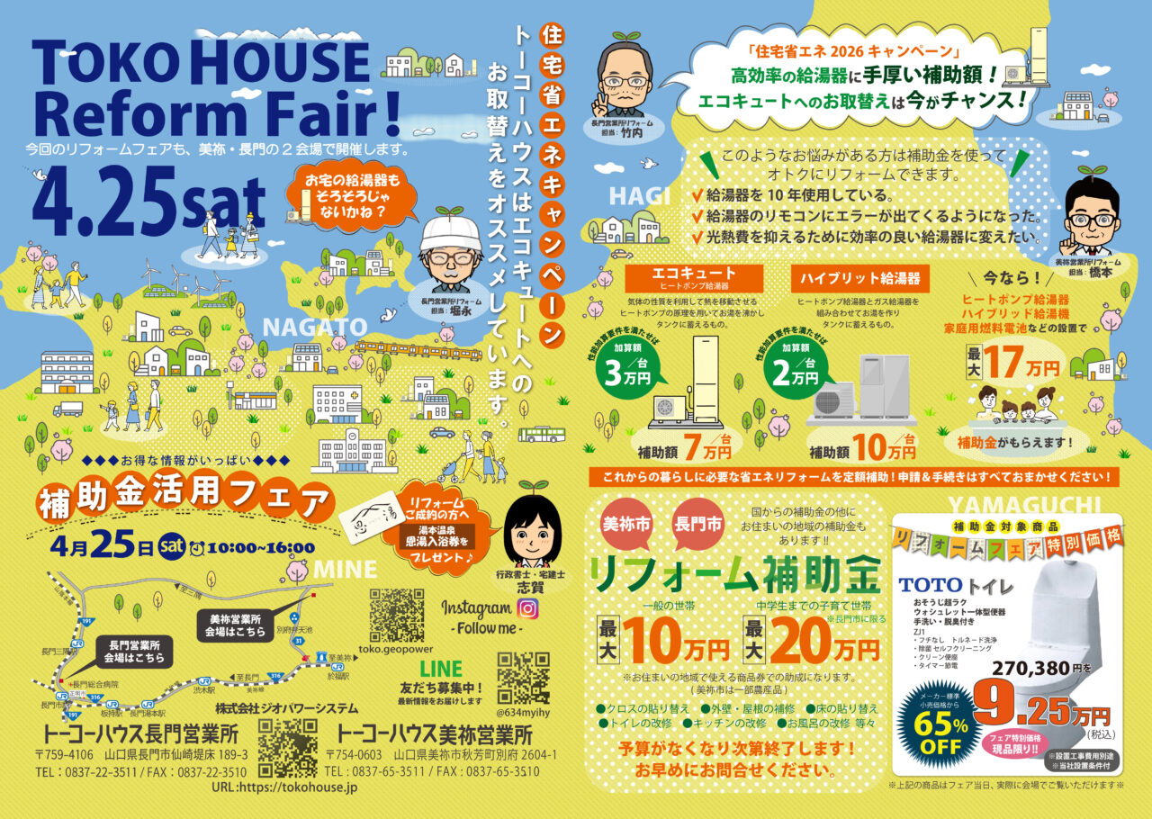 🌸ト-コ-ハウス の補助金活用相談会&リフォームフェア🌸を 4月25日(土)、今回も長門市と美祢市の2会場で開催!!🌸🌸🌸